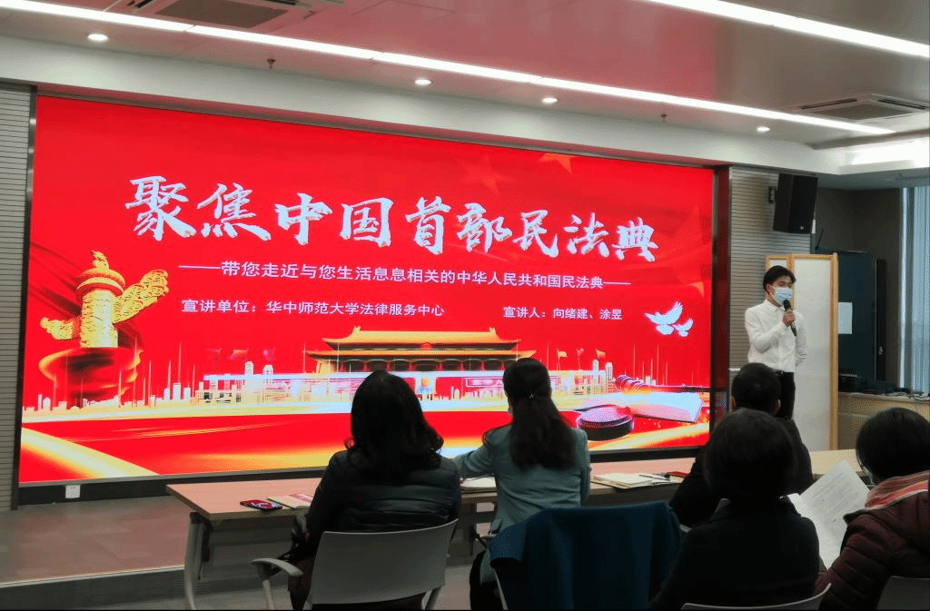 会议伊始,由校法律服务中心的向绪建、涂昱进行民法典宣讲。两位同学以《聚焦中国首部民法典》为题,从民法典的编纂历程、民法典的体系和意义、民法典亮点内容解读三部分进行宣讲,为全体教职工普及了民法典的相关知识。