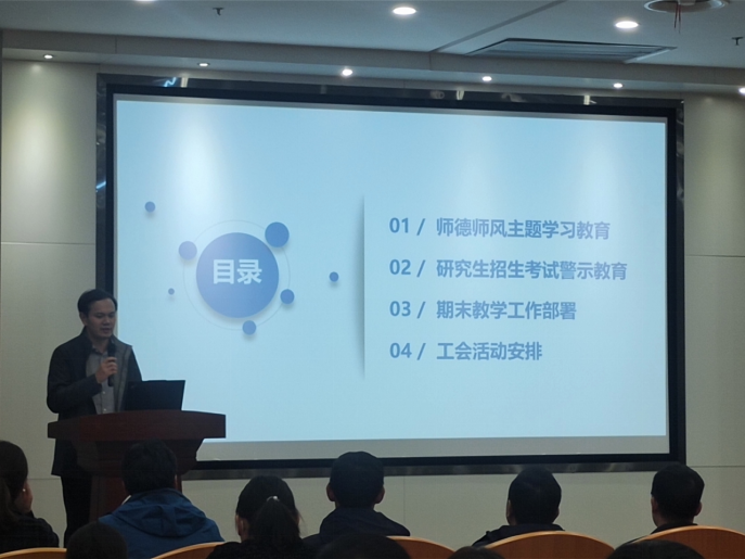 会议中,教育信息技术学院副院长童名文对2023年秋季学期学期末教学工作的重点任务进行了安排部署,希望各位老师能够合理安排工作时间,按时完成教学工作。