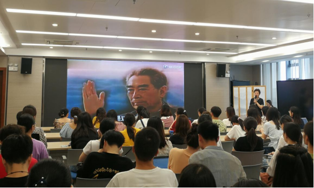 伴随着百年恩来宣传片,盘华老师为党员们演唱《你是这样的人》,在歌声中带领党员们进入党史学习的浓厚氛围。盘华老师分享了她们那个年代的人对周恩来的印象,她说:“提起周恩来,就想起他爱党爱民,兢兢业业的崇高风范”,周恩来是中国共产党的先锋与模范。中国共产党自1921年成立以来,经历了“开天辟地”“改天换地”“翻天覆地”“惊天动地”四个伟大发展阶段,到2021年中国共产党成立100周年之际,共产党员不断地重温党的历史,铭记历史的经验与教训,以史为镜,以史明治,知史爱党,知史爱国。