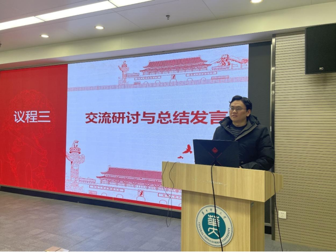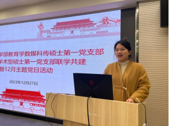 本次主题党日活动分为支部建设经验交流分享、12月主题党日学习与研讨交流三个环节。在支部建设经验交流分享环节,教育学数媒科传硕士第一党支部书记亢立和法学院学术型硕士第一党支部书记林莎莎分别就支部情况与支部建设特色进行介绍。亢立强调要将支部建设与专业优势相结合,提出支部发展“搭起来”与“走出去”的方向。林莎莎重点介绍了法学院学术型硕士第一党支部的特色工程“七个一”活动,展现了支部独具特色的党建风格。