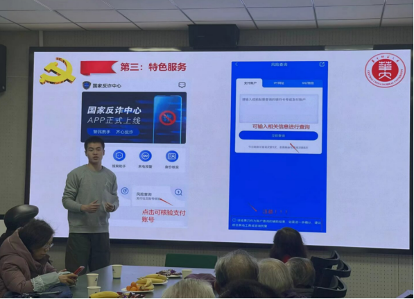 讲座结束后,教育技术学硕士第一党支部俞超同学为退休教师们介绍了八种常见的诈骗手段,用真实案例揭示了诈骗分子的狡猾险恶,并分享了识别和防范诈骗的方法。此外,俞超同学还介绍了国家反诈APP的功能和特点,现场演示了APP的使用方法,引起了与会者的广泛共鸣。大家纷纷表示这次活动不仅让他们认识到了诈骗的危害性,更学会了如何更好地保护财产安全。