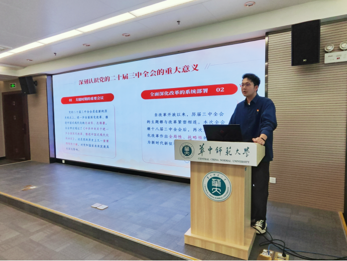 (通讯员 焦玉环 连世强)为深入学习贯彻党的二十届三中全会精神,9月27日下午,教育技术学硕士研究生第二党支部学习贯彻党的二十届三中全会精神宣讲会在南湖综合楼7001报告厅举行,支部书记连世强同志以《进一步全面深化改革的行动纲领——学习贯彻党的二十届三中全会精神》为题作了宣讲报告,支部全体党员、入党积极分子参加会议。