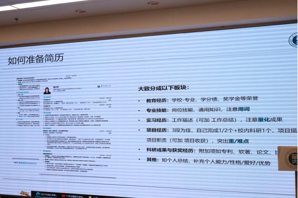 本次主题党日活动的另一亮点是“榜样红”求职经验分享环节,为即将步入职场的学生党员和毕业生提供了宝贵的职业指导。数字媒体技术专业的研三学姐陆子欣结合自身丰富的求职经历,从求职准备到成功签约的全过程进行了细致的分享。她重点讲解了如何制作一份具有竞争力的简历,包括如何突出自身优势、匹配岗位需求等技巧,并结合案例展示了具体优化方法。不少与会学生表示,学姐的经验分享不仅提供了切实可行的求职思路,更让大家对自己的职业发展充满了信心和期待。