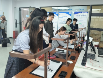 活动伊始,在研究院讲解员的带领下,师生们依次参观了智能教育装备展示区、智慧教室、智能教育生态展厅等专门展区。在智能教育装备展示区中,同学们亲身体验了科大讯飞智慧体育课堂、超星课外阅读机、华文众合书法课堂等AI教学实际应用场景,充分体会到数字教育的个性化和高效性。