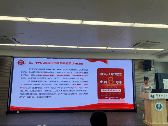 在“学生党员领学主题教育”环节,农翠芹以“深入贯彻中央八项规定精神重要论述、有力有序贯彻执行中央八项规定精神”为题展开领学,系统总结了十年来党中央推进作风建设的历史性成就,特别是通过数据分析展示了教育系统在整治“四风”问题、规范办学行为等方面取得的显著成效。茹琦琦则围绕“深入贯彻中央八项规定精神的成效与经验”进行分享,她通过梳理党的十八大以来习近平总书记关于作风建设的重要论述,结合教育领域典型案例,深入阐释了中央八项规定精神的时代价值和实践要求。