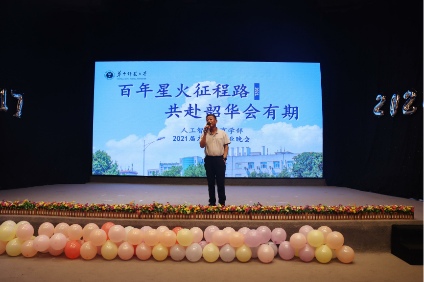 人工智能教育学部讯(记者 冯歆媛 徐清妍)6月10日晚,人工智能教育学部在九号楼六楼演播厅举办了以“百年星火征程路,共赴韶华会有期”为主题的2021届本科生毕业晚会。人工智能教育学部党委书记罗丽华、副部长刘清堂、党委副书记钟文锐、党委副书记黄涛、文科综合国家级实验教学示范中心实验中心副主任黄勃、教师欧阳泓杰、教育技术系主任罗恒、1701班班主任王贵才、1705班班主任谭政及各年级辅导员应邀出席了本次晚会。