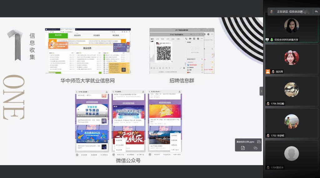 2017级本科生辅导员周洪茜主持会议。会议伊始,由签约至四川省成都市茶店子小学的教育技术学专业师范生邓慧桢、签约至宜昌金东方教育集团的数字媒体技术专业学生余诗梦分别作就业经验分享。邓慧桢从投递简历、笔试准备、面试经验及工作计划四个方面进行阐述,不仅向同学们传授了简历制作技巧,还分享了应聘教师的笔试和面试流程,并强调提前做好工作计划的重要性。余诗梦结合自己应聘企业单位的经历,提醒同学们积极关注华师就业信息网、招聘信息群及微信公众号等信息发布渠道,广泛地搜集、整理信息,同时讲解了签约涉及的相关问题。