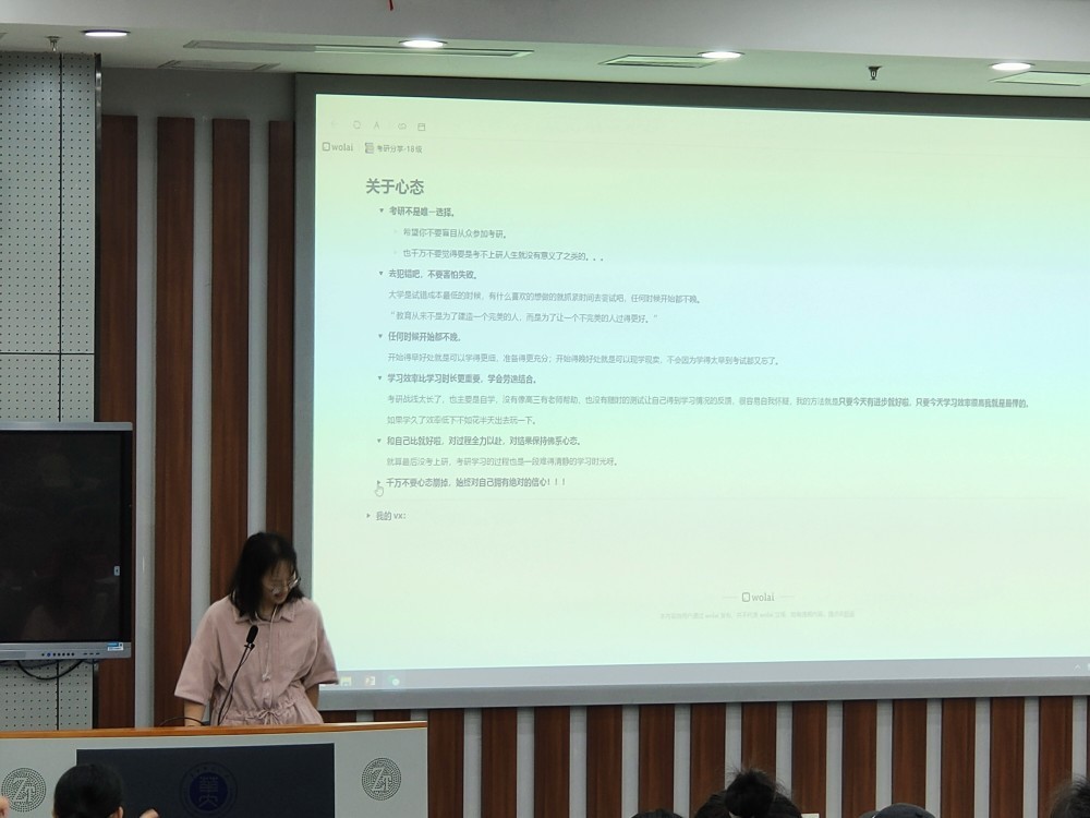 最后,数字媒体技术专业刘雨虹同学以思维导图的方式对考研进行了全方位的分享,不仅总结分享了她上一届学长学姐们的经验和自己的备考计划,也在人际关系和身体健康等方面问题上给予了同学们新的答案。
